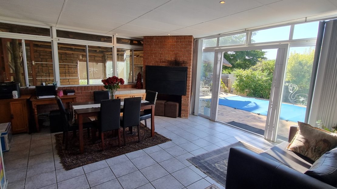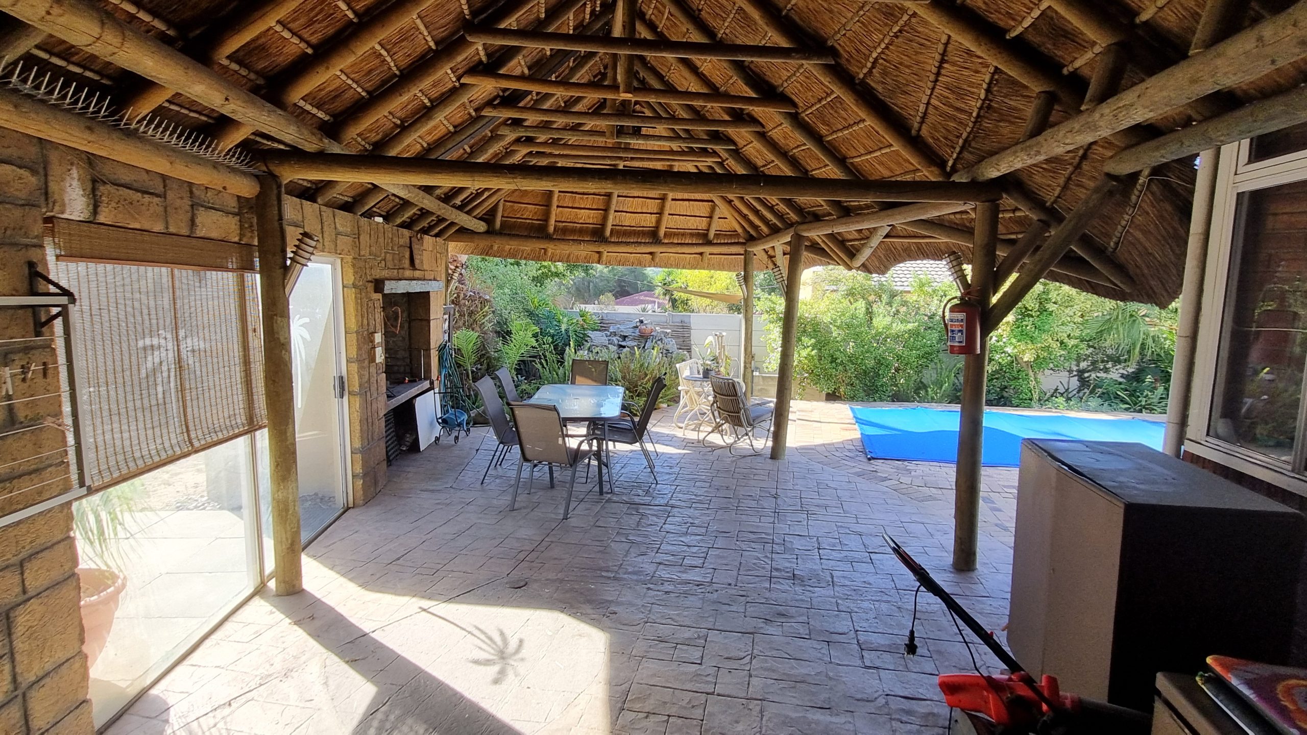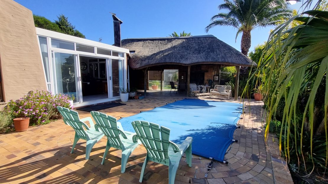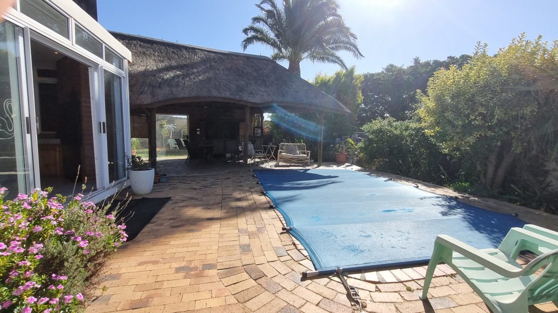 Offering 3 double size bedrooms, 2 bathrooms, 4 open plan living areas flowing to a most pleasant, fully enclosed pool area with a huge 43 m2 thatched roof lapa, braai en sparkling swimming pool.